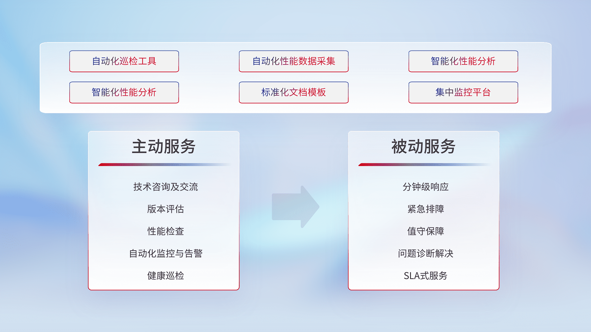 智能化工具和标准化文档,,保障服务质量,,,,提供主动服务(包含技术咨询、、版本评估、、、、性能检查、、自动化监控与告警、、健康巡检)和被动服务包含(分钟级响应、、、紧急排障、、值守保障、、问题诊断解决、、SLA服务)。。